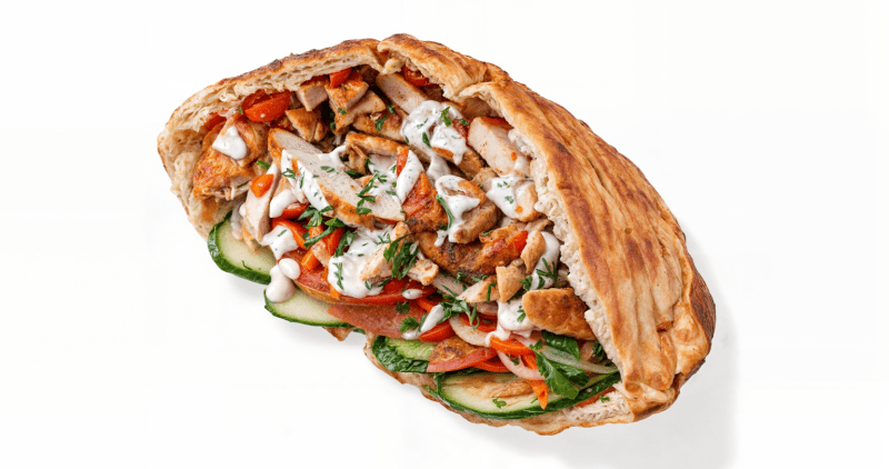 Состав: лепёшка тандырная,мясо курицы,морковь,помидоры,огурцы,лук,зелень,соус томатный,соус чесночный.