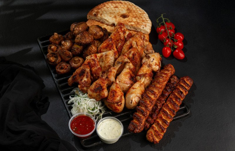 Состав: шашлык из куриных крыльев (700 гр), шашлык из куриных ножек (700 гр), люля из курицы (3 шт), грибы на мангале (1 порция), картофель на мангале (2 порция), лепешка тандырная (1 шт), соус чесночный (2 шт), лук, зелень. Сет подойдет для 3-4 человек.